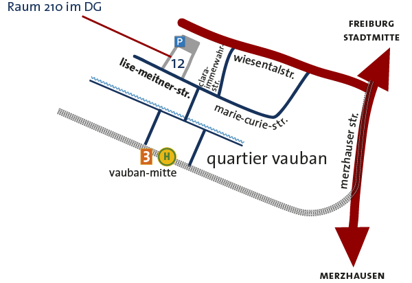 - aus der Stadtmitte mit der Stadtbahnlinie 4 (ab 15.12.2024) bis Vauban Mitte